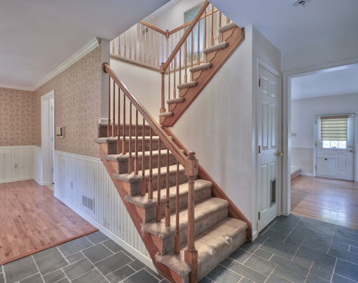 The slate foyer welcomes you and is flanked by the dining room with bay window and the living room with French doors and hardwood floors. Foyer opens to large open kitchen/family room combination with fireplace.