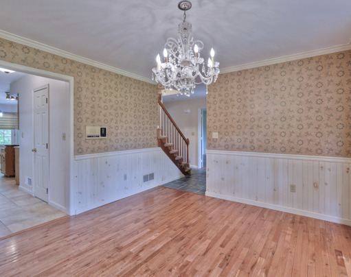 The dining room is brightened with the stunning chandelier, perfect for gatherings for the whole family!